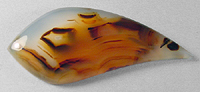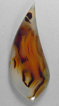 Offered here is a large, deluxe cabochon of Montana agate, cut from Yellowstone River agate found long ago. This particular piece was selected from an old stash of 5 gallon buckets full I lucked into a few summers back. The agate is quite clear, and contains several ribbon-like fortification bands of carnelian orange, brown, and inky black. I think it's a nice example of banded Montana agate, and it does show some turtleback effect when held to the light, though I neglected to take a backlit photo. It has a rounded dome of 5mm, a designer 'flame' shape, and a brilliantly glassy polish both front and back.