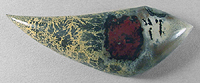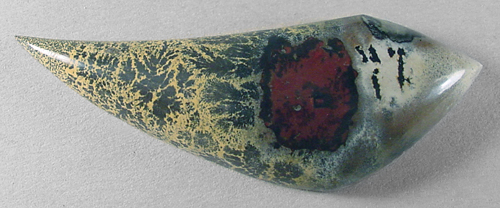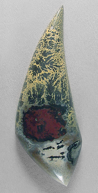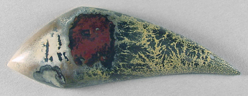 Offered here is a cabochon of nature's paintbrush jasper, which hails from China. This unusual material has only been available to lapidaries for about 10 years or so, in very limited supply, and it certainly has a lot going for it. I've cut many examples of this jasper, but they always seem to sell before I can get them onsite! Anyway, this one has an attractive combination of colorful figures, nicely contrasting magenta and pale yellow, and an absolutely amazing display of jet black dendrites. It'll look fantastic in even the simplest setting. The stone has a high rounded dome of 8mm, and a bold designer 'flame' shape, brightly polished both front and back.