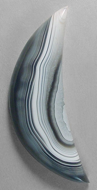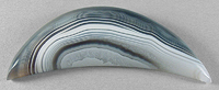 Offered here is a cabochon of tuxedo agate. This interesting example features contrasting banded figure in black and blue-white to gray bands. It has a good degree of parallax, in that the bands seem to wiggle open and closed with movement. This beauty will be amazing in even the simplest of settings, no doubt. It has a well rounded dome of 6mm, a sweet designer 'crescent' shape, and a brilliant glassy polish both front and back.