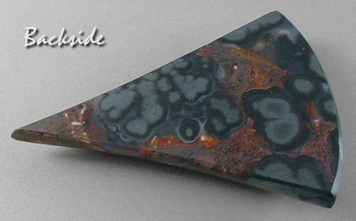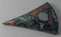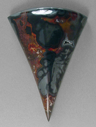 Offered here is an unusual cabochon of psilomelane plume agate, from Chihuahua, Mexico. This stone was actually cut from an isolated area within a piece of gold leaf agate, which often contains inclusions of psilomelane. There are several dark metallic plumes against a dark reddish background that looks to be a jasper/agate blend. As is typical with gold leaf agate, there are some tiny white bits of confetti, and a sparkly drusy lined vug. Much of the stone is very highly reflective, like a black mirror, making photography quite challenging, but the pics should give you the idea; the side view illustrates it best. This cab has a bold 'chevron' shape, a high rounded dome of 8mm, and a slick glassy polish both front and back.