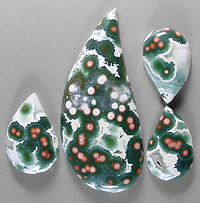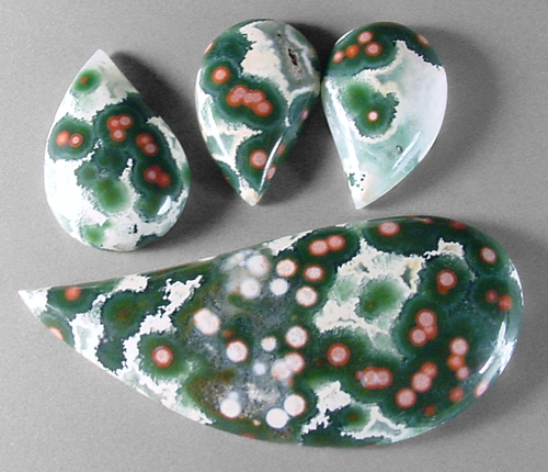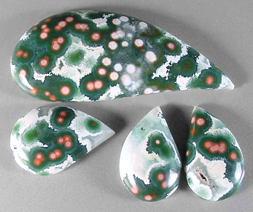 Offered here is a matching suite of four ocean jasper cabochons. This vintage Madagascar material has a superbly eye-catching contrast, with each of the stones featuring bunches of rosy coral pink to pastel pink orbs enveloped in deep forest green, in turn surrounded by snow white. They're sure to make treasured items of jewelry, almost effortlessly! The largest cab has a well rounded dome of 5mm, while the other three are each 4mm in thickness. All four of the stones have a gracefully curved designer drop shape, and a smooth glassy polish both front and back.