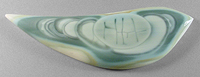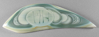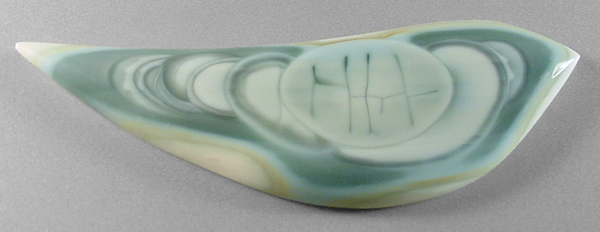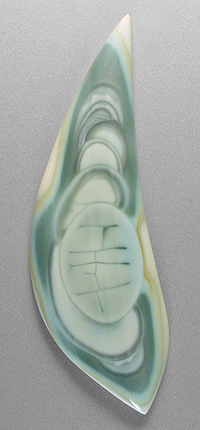 Offered here is a large & splendidly unique cabochon of Imperial jasper, from Mexico. This collectible 'ojitos' (little eyes) material is the very best of the best, and thankfully, I have amassed a huge old horde of outstanding rough nodules so I can continue to share them with you. The figure in this remarkable stone is composed of orbs stacked one atop the next, with a neat craquelure pattern in the foremost orb that resembles block lettering. It is a study in various soft pastel shades of green, with darker nuanced shading. There's a band of avocado green edging and creamy old ivory around most of the perimeter, too. The backside is outrageously beautiful as well, so an open backed setting would be just the thing to show off *both* sides. The stone has a well rounded dome of 5mm, a gracefully curved designer 'flame' shape, and a brilliantly glassy polish both front and back.