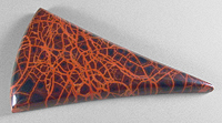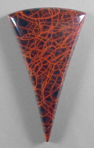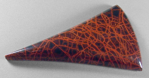 Offered here is a cabochon of spiderman jasper, which was mined near the Oregon/Idaho border. This particular stone was cut from material hand selected in Quartzite a few years back, and I think it's of a higher quality than most. It's actually the nicest I've ever seen. It certainly cuts an interesting cab, jam packed with wild reddish-orange spiderwebbing against a background of very deep reddish brown to black. It's just bound to make a fascinating item of jewelry, and I encourage you to give it a try. The cab has a well rounded dome of 5.5mm, a versatile designer shape, and a smooth glassy polish both front and back.