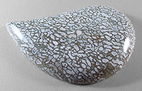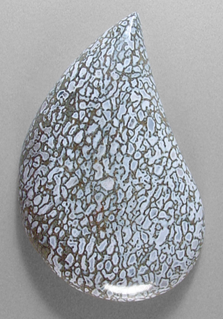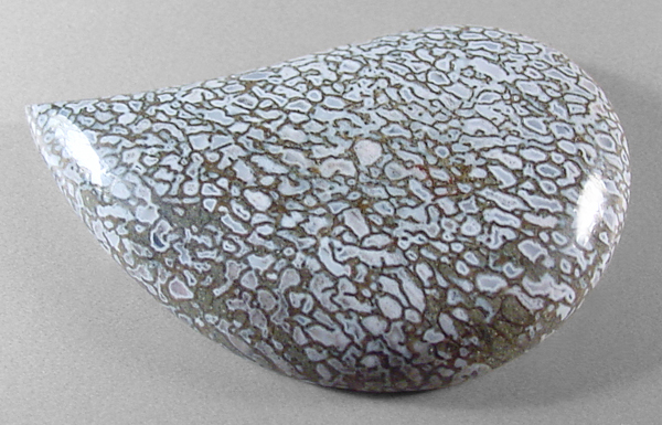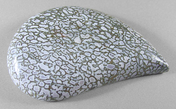 Offered here is a cabochon cut from fossilized dinosaur bone, found in Utah. This highly silicated material is many millions of years old, a marvelous example of the natural preservation of our earth's ancient, extinct 'thunder lizards'. Over millennia, the cells in this fossil bone have been completely replaced with unusual white agate, with subtle hints of the palest pastel shade of bluish-white. Some of the cores within the cells are a bit darker and more bluish-gray. And happily, there is not even a hint of any calcification; this bone is remarkably hard, and is without the frustrating flaws that typically plague gem bone material. The bold webbing contrasts nicely, enhancing the details to the fullest. The cab has a high and well rounded dome of about 7mm, a plump designer teardrop shape, and a smooth, gleaming polish both front and back.