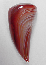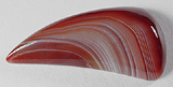 Offered here is a designer cabochon of vibrant Lake Superior agate. This highly collectible agate sure cuts a delightful stone! This fine example's showing the great banding so typical of prize lakers, in warm cherry orange, peach and white. Nice parallax effect too, in that the bands seem to open and close with movement. The stone has a very high rounded dome, a sleek 'talon' shape, and a super glassy polish both front and back.