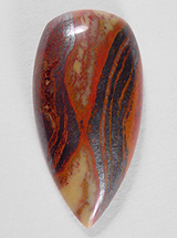 Offered here is a bold cabochon of orange jasper with hematite, from Australia. It features yellow spoltches framed by orange and seemingly black bandings, but those dark ones are actually shiny silvery hematite. The metallics add a striking contrast, but were difficult to capture digitally; you can catch only a glimpse of their true nature in these photos. The cab has a very high rounded dome, a gracefully sleek 'almond' shape, and a fine glassy polish both front and back.