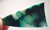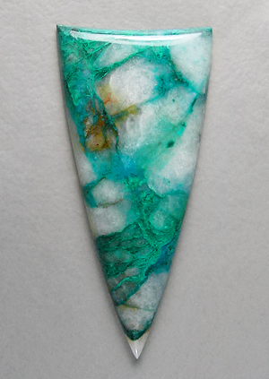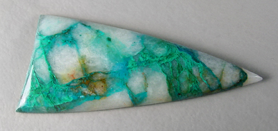 Offered here is a vivid cabochon of chrysocolla in quartz, from Arizona. This striking stone features webs and ribbons of electric blue chrysocolla, and some areas of equally brilliant greenish malachite. The saturated colors contrast strongly against a background of snow white, which is nicely translucent, as illustrated by the backlit photo. Simply delicious! The stone has a low but well rounded dome of 4mm, a crisp designer shape, and an excellent polish both front and back.