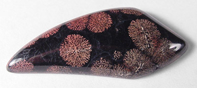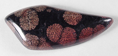 Offered here is an unusual cabochon of collectibly rare flowering obsidian, from Mexico. It features several wild starbursts of dark and light pink that stand out wonderfully against a jet black background. The pom-poms are shaped exactly like exploding fireworks! A very cool material quite unlike any other obsidian, and I must say I like it a lot; every cab is totally unique! The only flaw I can see is a tiny void, visible at the bottom right in the third photo, but it should be completely concealed by most any setting. The stone has a high rounded dome of 6mm, a sleek designer shape, and a glassy polish both front and back.